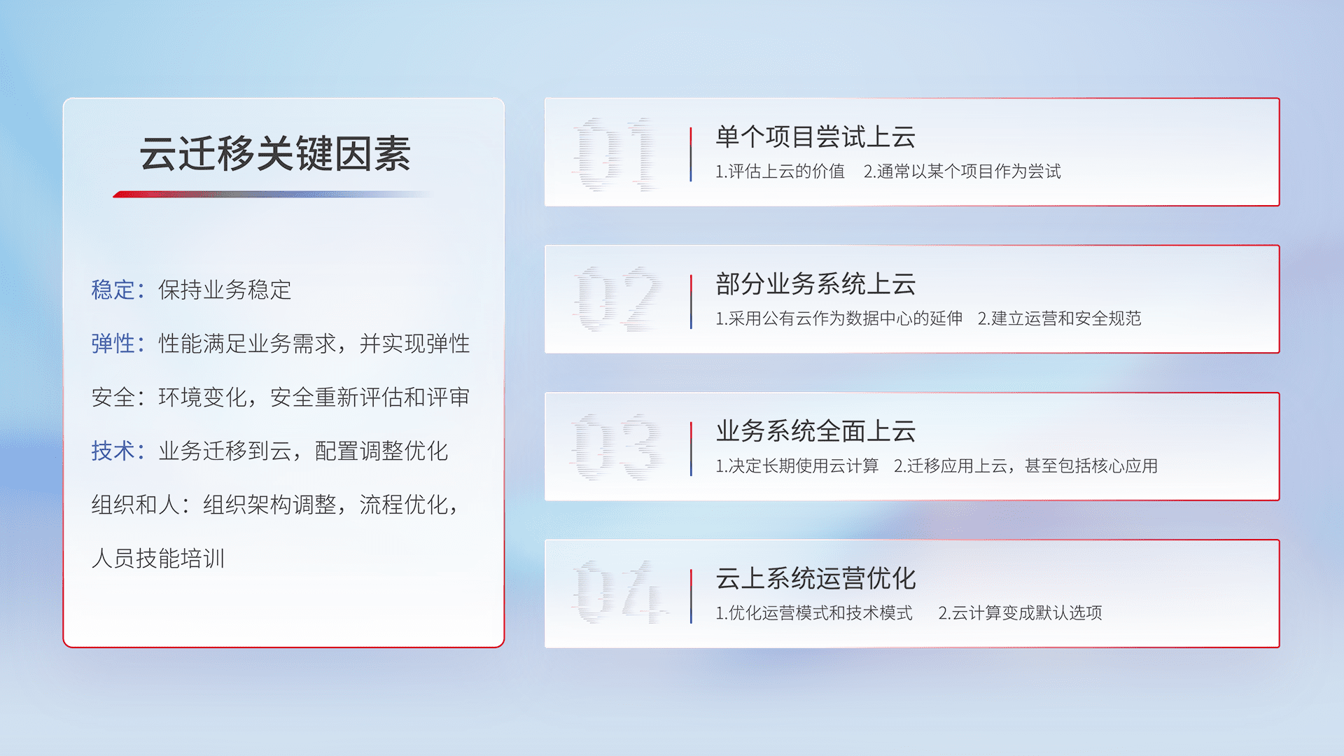 结合实际业务,,从规划设计、、、、云平台选型、、、、云原生改造、、、数据迁移、、集成交付,,,迁移全过程为客户识别最佳上云路径,,做好风险识别管理,,设计网络架构、、、身份权限、、、安全审计合规、、、操作审计、、、日志审计、、、监控告警策略、、多站点容灾设计等,,,对云上基础设施进行整体规划,,提升IT治理水平,,,,以满足弹性、、、、高可用、、高性能的需求。。。